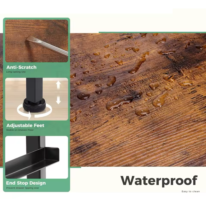 Lightweight, Stable Build — Constructed around a powder-coated steel frame with a wipe-clean wood-effect top and adjustable feet for balance.