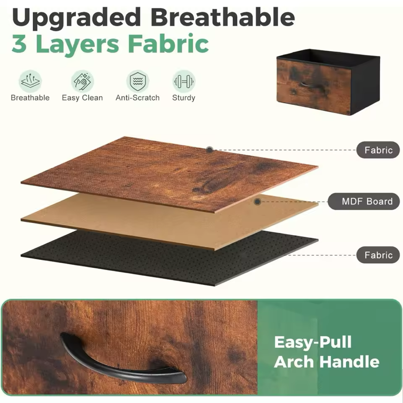 Ample Storage — Seven roomy, foldable fabric drawers that can be removed for easy access or cleaning.